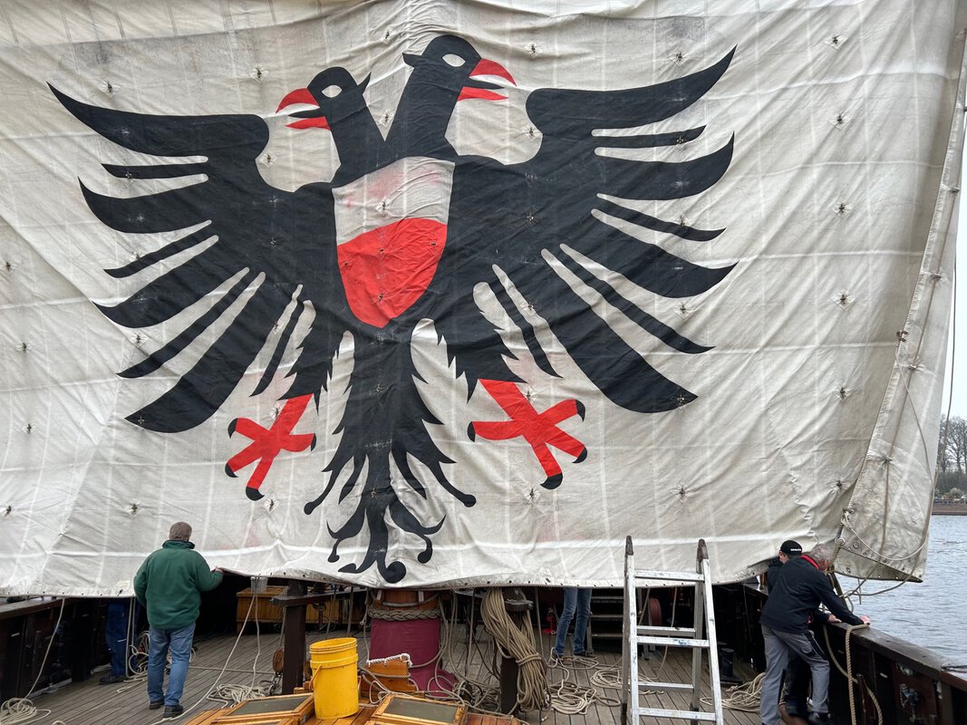 Nachdem sich die ersten Sonnenstrahlen an Deck ausgebreitet haben, wurden nun auch die Segel angeschlagen.